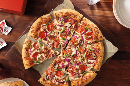 Una pizza más pequeña, un logotipo tallado en madera o un suelo…