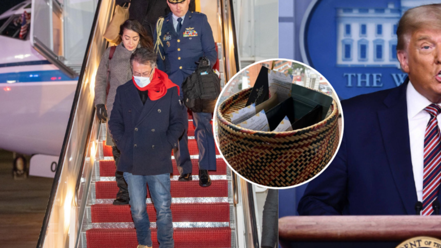 Se trata de una cesta típica colombiana que contiene tarjetas dirigidas a varios funcionarios como el presidente Trump, J.D. Vance y Marco Rubio.
