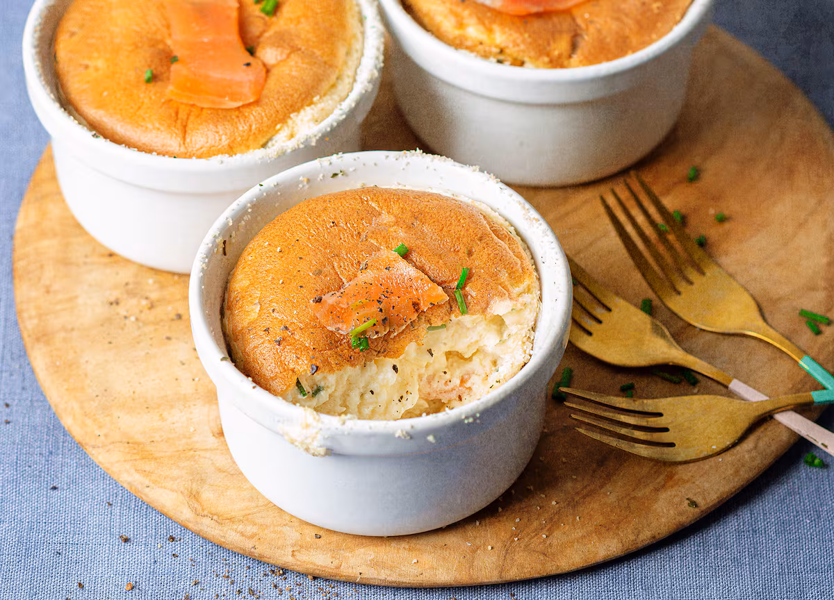 Sacar del horno los suflés y servir de inmediato con un trocito de salmón ahumado encima y más hierbas espolvoreadas.